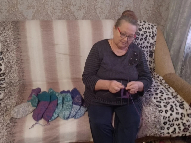 В с. Носовая социальный работник ГБУ "КЦСОН Краснобаковского муниципального округа" Кузьмина Татьяна Васильевна вяжет тёплые носки для отправки в зону действия СВО.